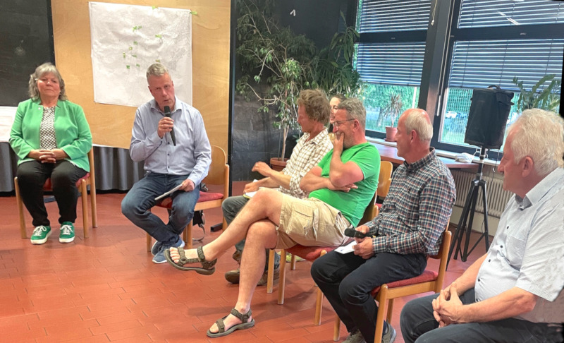 Traude Koch (GAL) führte im Auftrag der Vorbereitungsgruppe (Siegrun Fritz, Reingard Stoll, Stephan Wörner) in den Abend ein, benannte stichwortartig einige der aktuellen Probleme, wie die aus der Realteilung entstandene Kleinteiligkeit, die Konkurrenz von Ackerflächen zu Bebauung und Energieerzeugung. „Wir können unser Land nicht ernähren“ (Zitat Siegrun Fritz), weil wir als VerbraucherInnen viel tierisches Eiweiß zu uns nehmen, weil Getreide zu Gas verarbeitet wird und weil die Gewinne vor allem bei Händlern und Konzernen hängen bleiben. Die Ernährungssicherheit, zu der